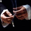 Description: Closeup of a man's hands wearing a black suit jacket and white shirt. One hand is holding a cigarette.